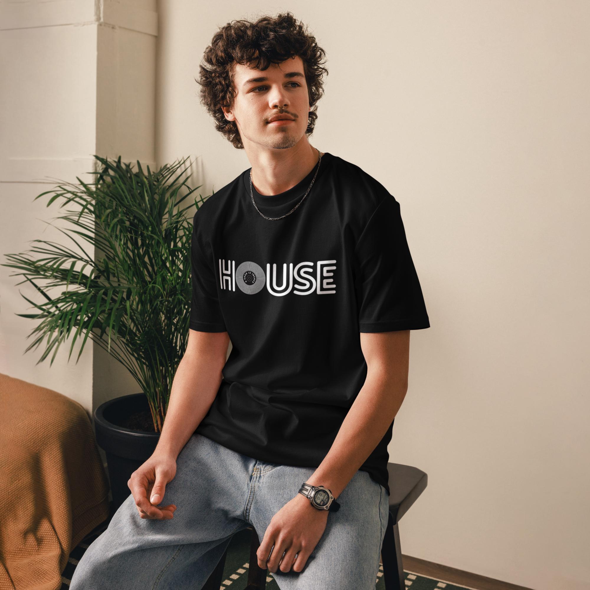Straight from the underground. Black tee, clean white HOUSE print — the ‘O’ drops as a vinyl record with a good 12 inches on the label. On the back, a good 12 inches runs across like a hidden groove.